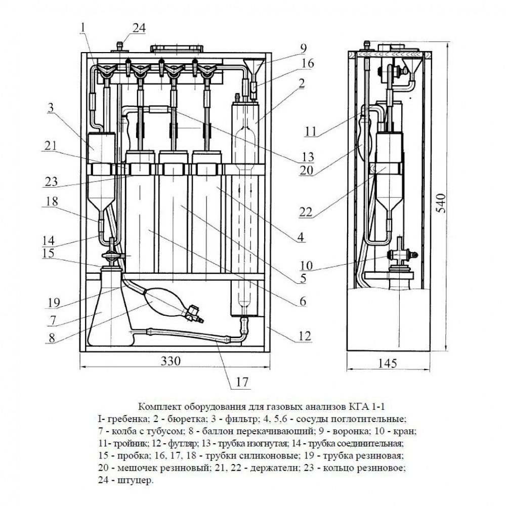 Газоанализатор КГА 1-1 предназначен для определения объемного содержания суммы всех кислотообразующих газов, кислорода, окиси углерода или непредельных углеводородов в дымовых и газовых смесях по методике ГОСТ 5439-76. Принцип действия газоанализатора КГА 1-1 основан на абсорбционном избирательном поглощении поглотительными растворами кислотообразующих газов, кислорода, непредельных углеводородов, находящихся в газовой или дымовой смеси.
