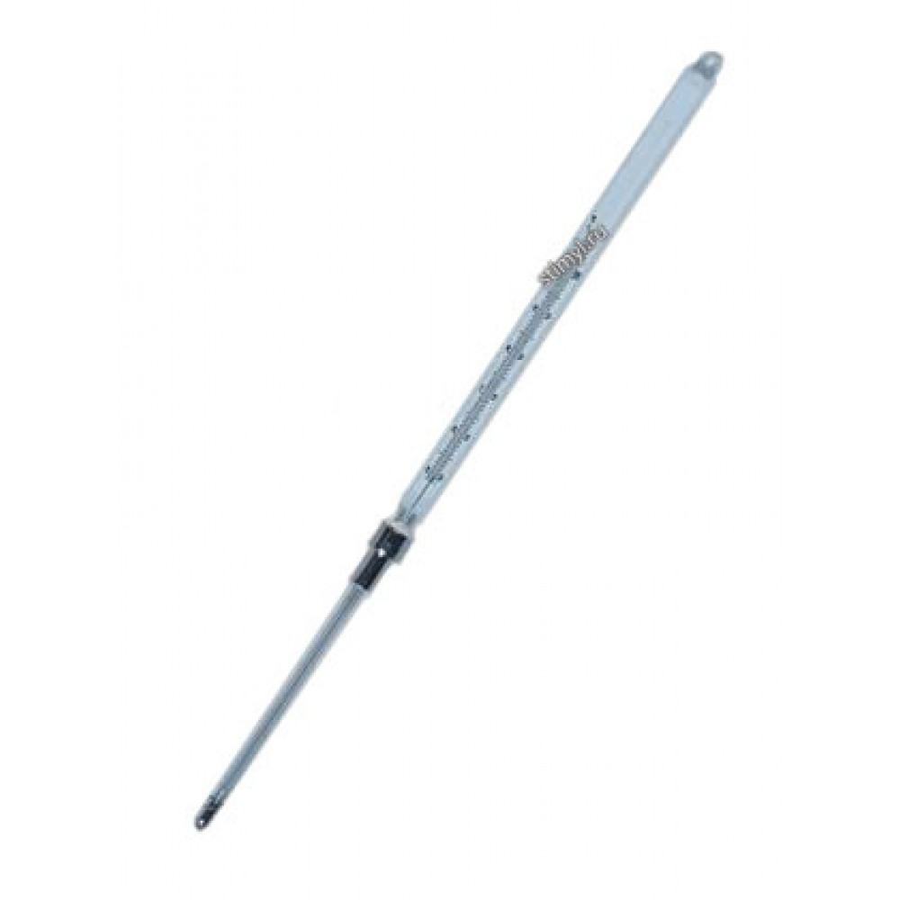 Термометр ТН-3 для определения вязкости. Предназначен для измерения температуры нефтепродуктов при определении условной вязкости (в вискозиметре Энглера). Термометр для определения вязкости.Предназначен для измерения температуры нефтепродуктов при определении условной вязкости (в вискозиметре Энглера).Изготавливается по ТУ 92-887.019-90.Термометр внесен в Государственный реестр средств измерений и имеет «Сертификат об утверждении типа средств измерений».КонструкцияСтеклянный термометр с вложенной шкальной пластиной из молочного стекла.В нижней части, над резервуаром, на корпус термометра насажена металлическая гильза.